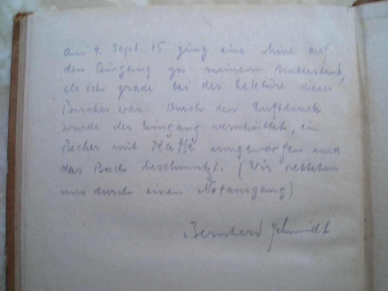 Am 4. Sept. 15 ging eine Mine auf den Eingang zu meinem Unterstand, als ich gerade bei der Lektüre dieses Buches war. Durch den Luftdruck wurde der Eingang verschüttet, ein Becher mit Kaffe umgeworfen und das Buch beschmutzt. (Wir retteten uns durch einen Notausgang)