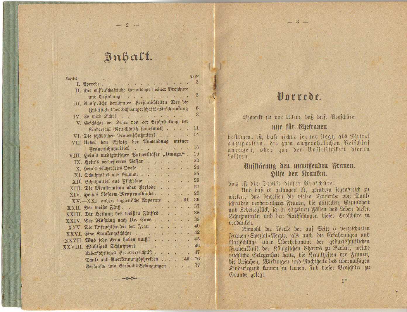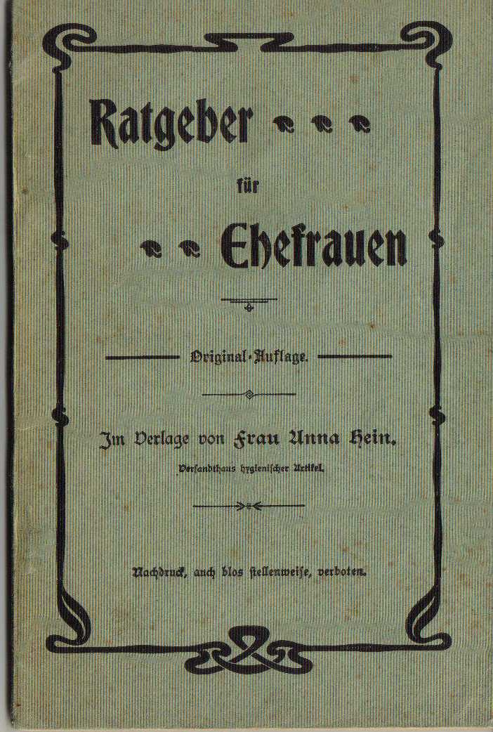 Der „Ratgeber für Ehefrauen“ von Frau Anna Hein, die ein Versandhaus hygienischer Frauen-Schutzartikel in der Oranienstrasse Nr. 65 in Berlin S. 42, Fernsprecher: Amt IVa, 6444 seit dem Jahr 1897 betreibt, widmet sich ganz diesem Thema.