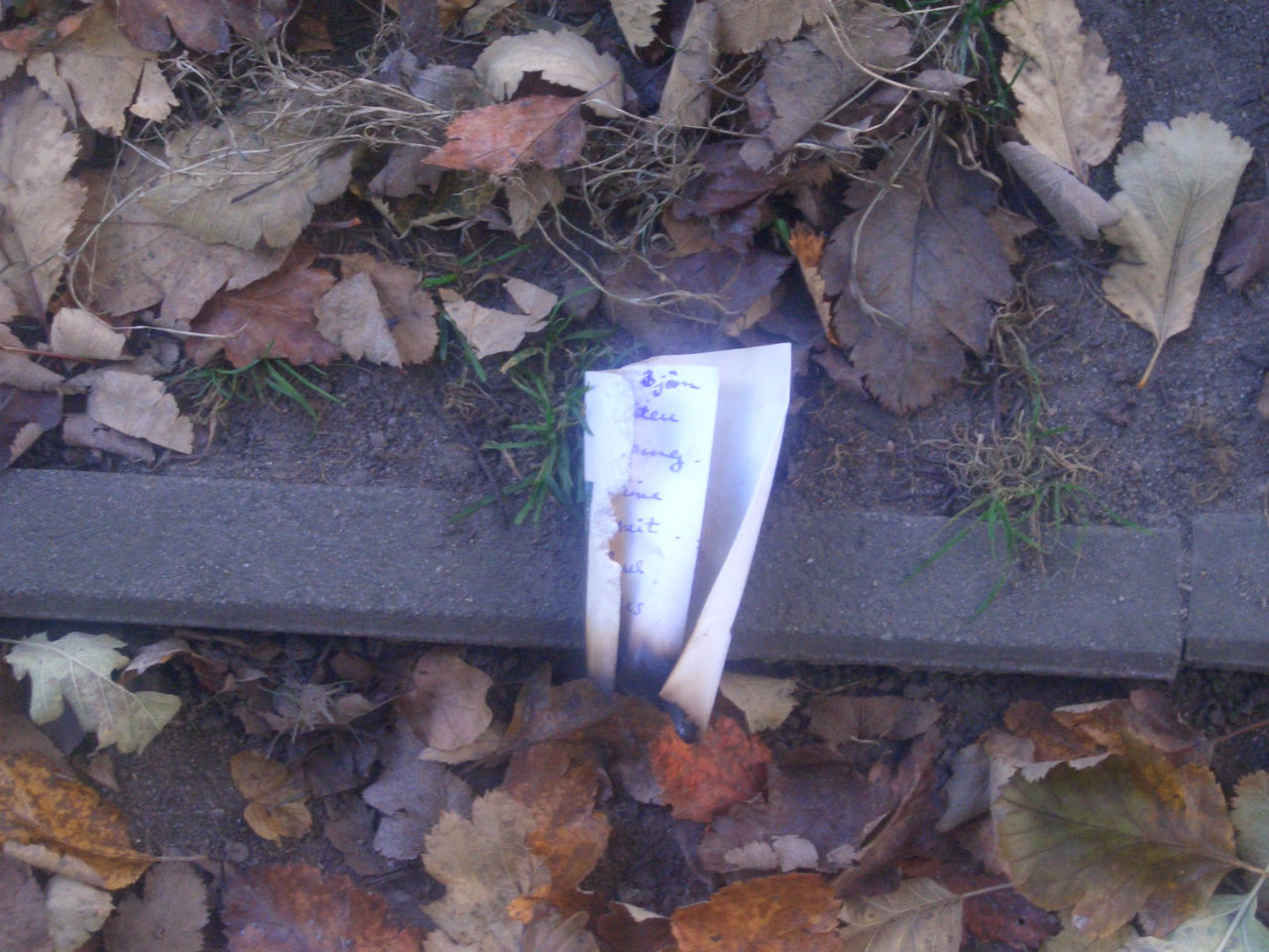 Er wurde wahrscheinlich zu einem Fidibus zusammengerollt und angezündet. Die Besitzerin war eine ängstliche Natur und hat nicht kaltblütig durch Hin- und Herwenden des Papiers für vollständige Verbrennung gesorgt, sondern mit einem „Huch“ den Brief in den Mülleimer neben der Bank geworfen. Hier erstickte dann das Feuer auf halber Strecke.